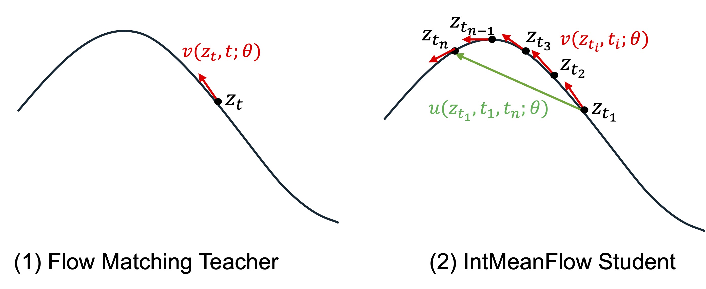 Figure 1. Conceptual Comparison of Flow Matching and IntMeanFlow
